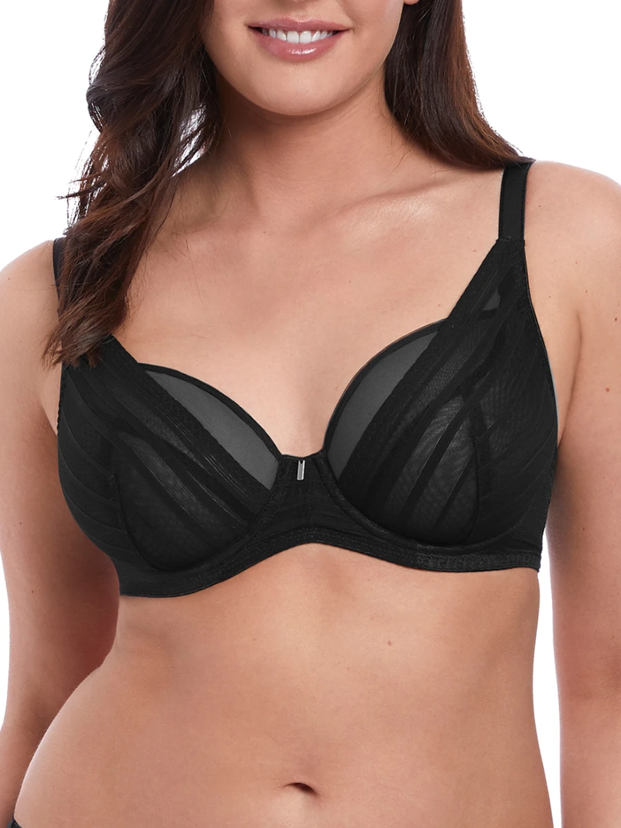 This fabulous bra features a striped mesh pattern over a black colourway, designed with semi-sheer fabric and a plunge neck. With stretch outer cups, it ensures forward projection and provides impressive support. This bra is light and breathable, without compromising on comfort or lift.